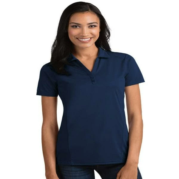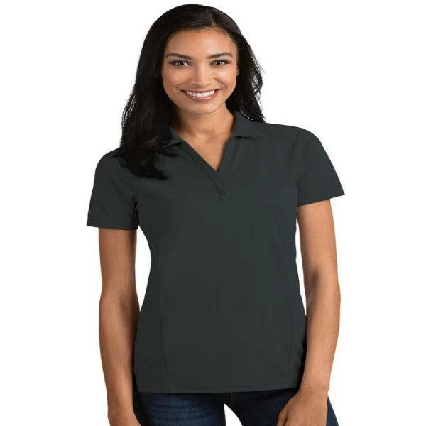 100% polyester desert dry moisture wicking interlock knit sold short sleeve polo with self fabric collar, 2-button y placket, open cuff and princess seams. antigua triangle patch at right sleeve.